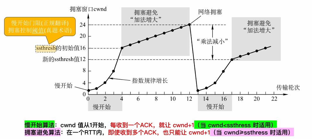 cwnd值从1开始,每收到一个ACK,就让cwnd + 1(当cwnd < ssthress时适用)